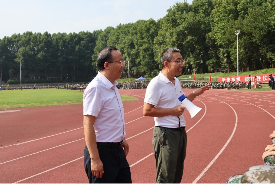 吴锋则从身体和政治两个层面出发,建议同学们在军训期间要互帮互助,通过军训锻炼体魄,提高身体素质,以更好的状态迎接新学期的到来。同时,他鼓励同学们积极向党组织靠拢,递交入党申请书。他表示,无论是军训还是学习学生中遇到任何问题,都可以随时与老师们沟通,学院始终是同学们坚强的后盾。