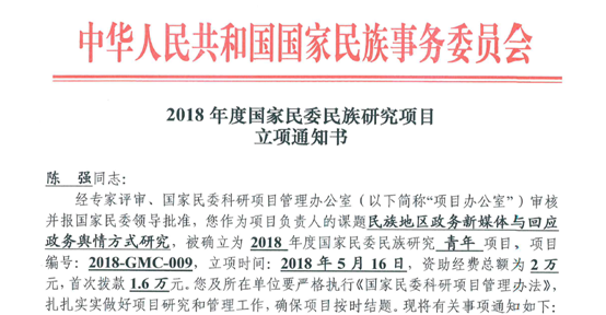 近日,国家民族事务委员会公布了“2018年度国家民委民族研究项目评审结果”,我院青年教师陈强副教授申请的研究课题“民族地区政务新媒体与回应政务舆情方式研究”获得青年项目立项(项目编号:2018GMC-009)。
