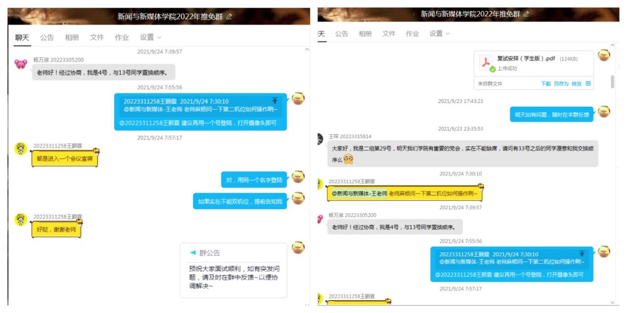 线上面试隔着一层电子屏,为化解考生紧张情绪,学院行政岗老师以行动传递温暖。正式复试前,学院组建预推免群,在群内公示复试相关的程序、规则,电话畅通及时解答考生疑问,为复试工作顺利展开保驾护航。
